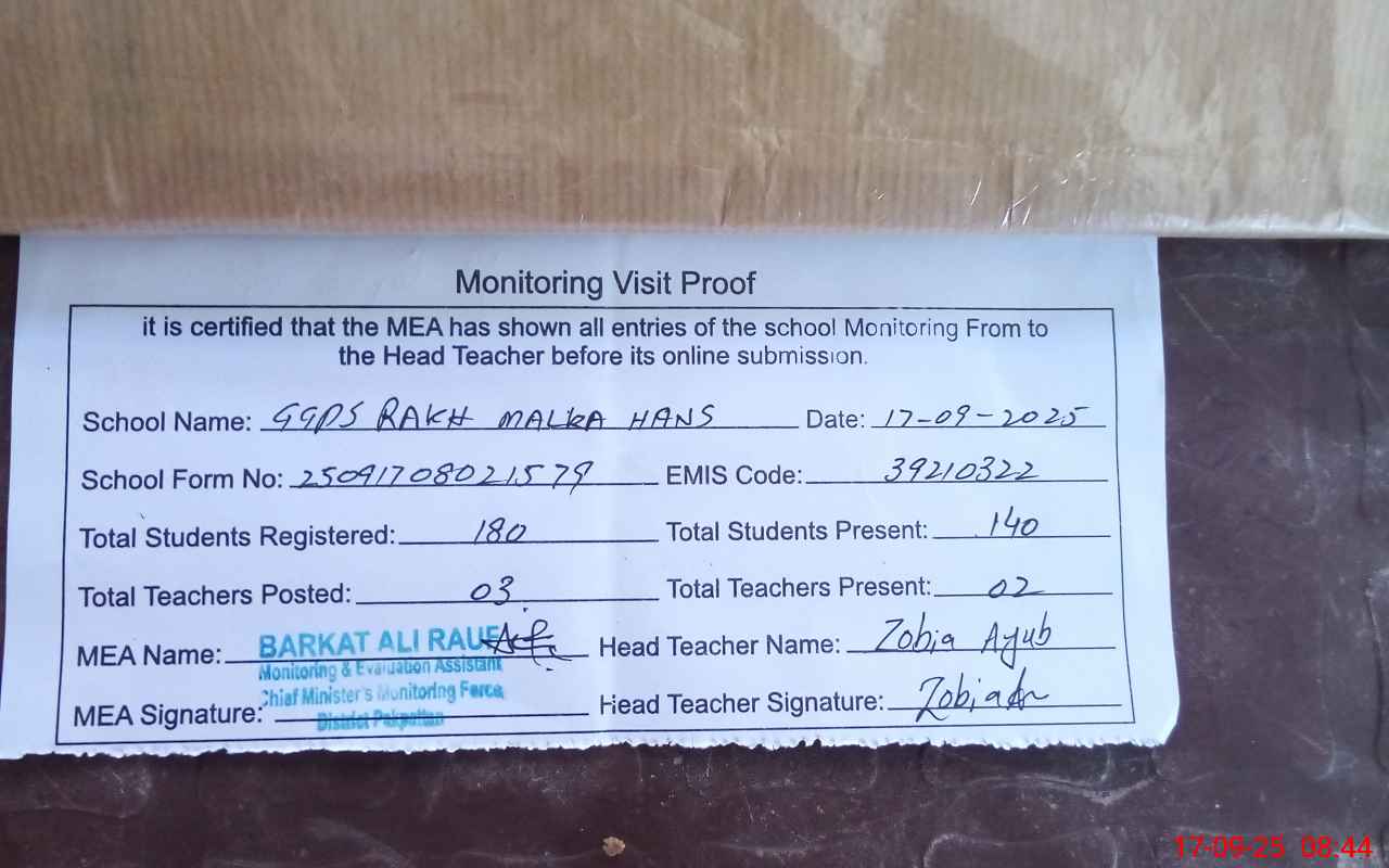 | EMIS Code: 39210322 | Name of School: GGPS RAKH MALIKA HANS | |||