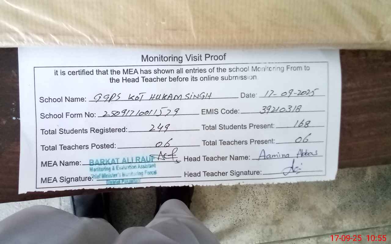 | EMIS Code: 39210318 | Name of School: GGPS KOT HUKAM SINGH | |||