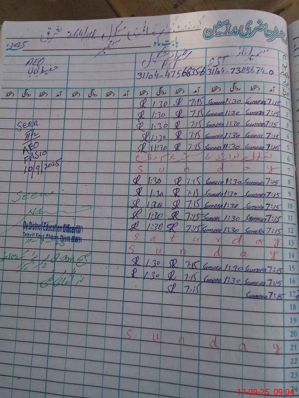 | Name: Su**** Na**** Designation: (School Headmaster's/Headmistress's) PST Phone/Cell Number: 03**** |