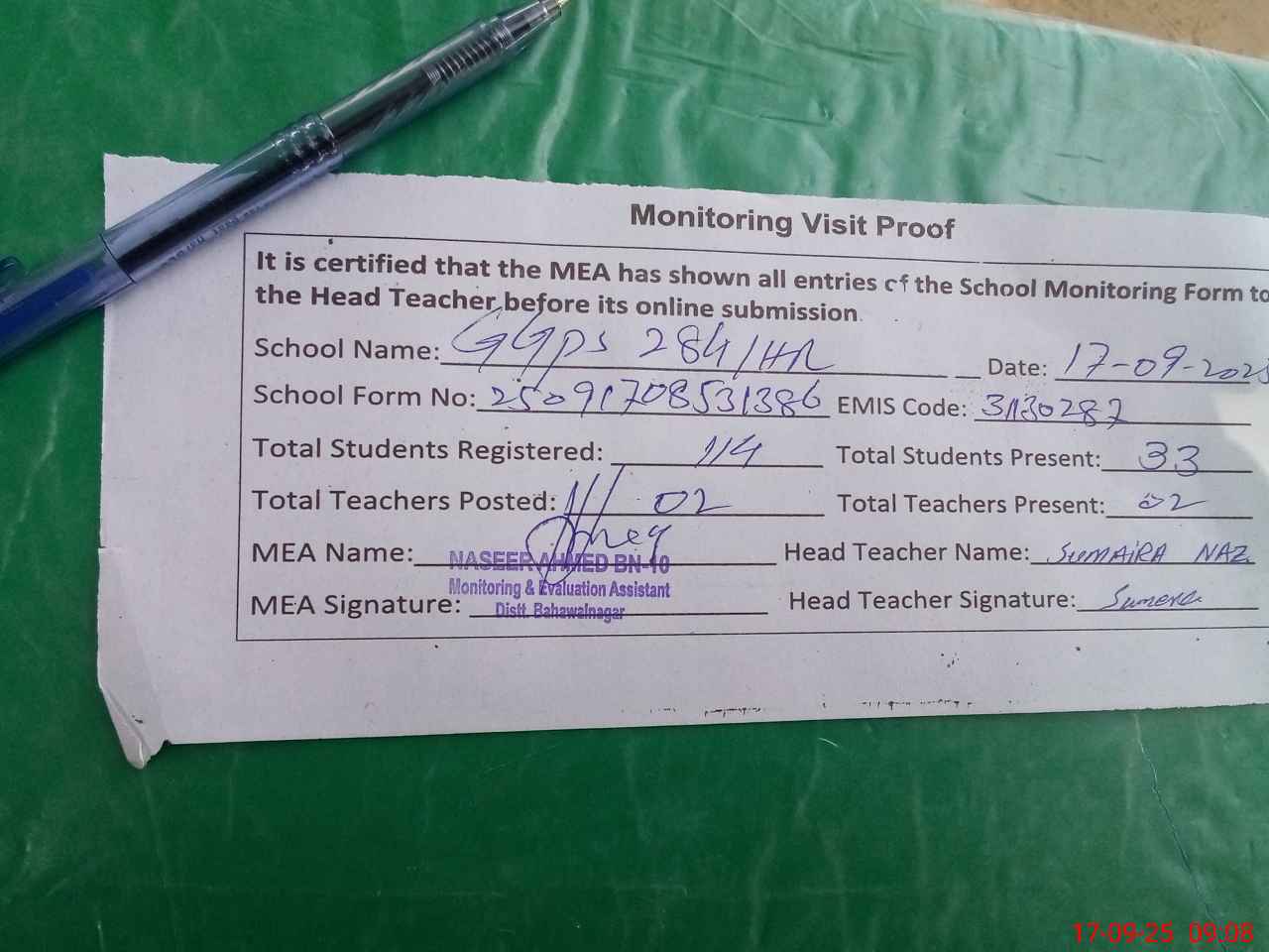 | Attendance Register | Head Teacher | MEA with School | Visit Proof |