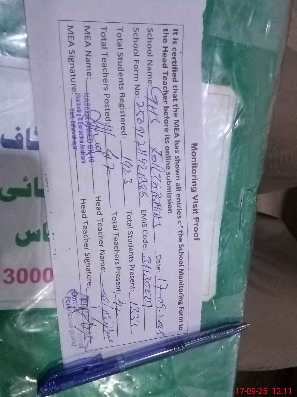 | Attendance Register | Head Teacher | MEA with School | Visit Proof |