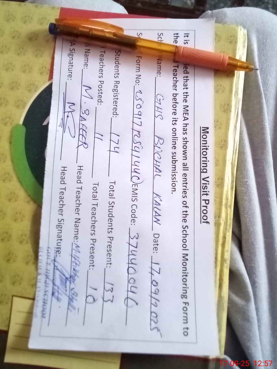 | Attendance Register | Head Teacher | MEA with School | Visit Proof |