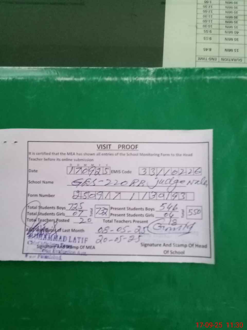 | EMIS Code: 33110226 | Name of School: GES CHAK 220 RB JUDGE WALA FSD | |||