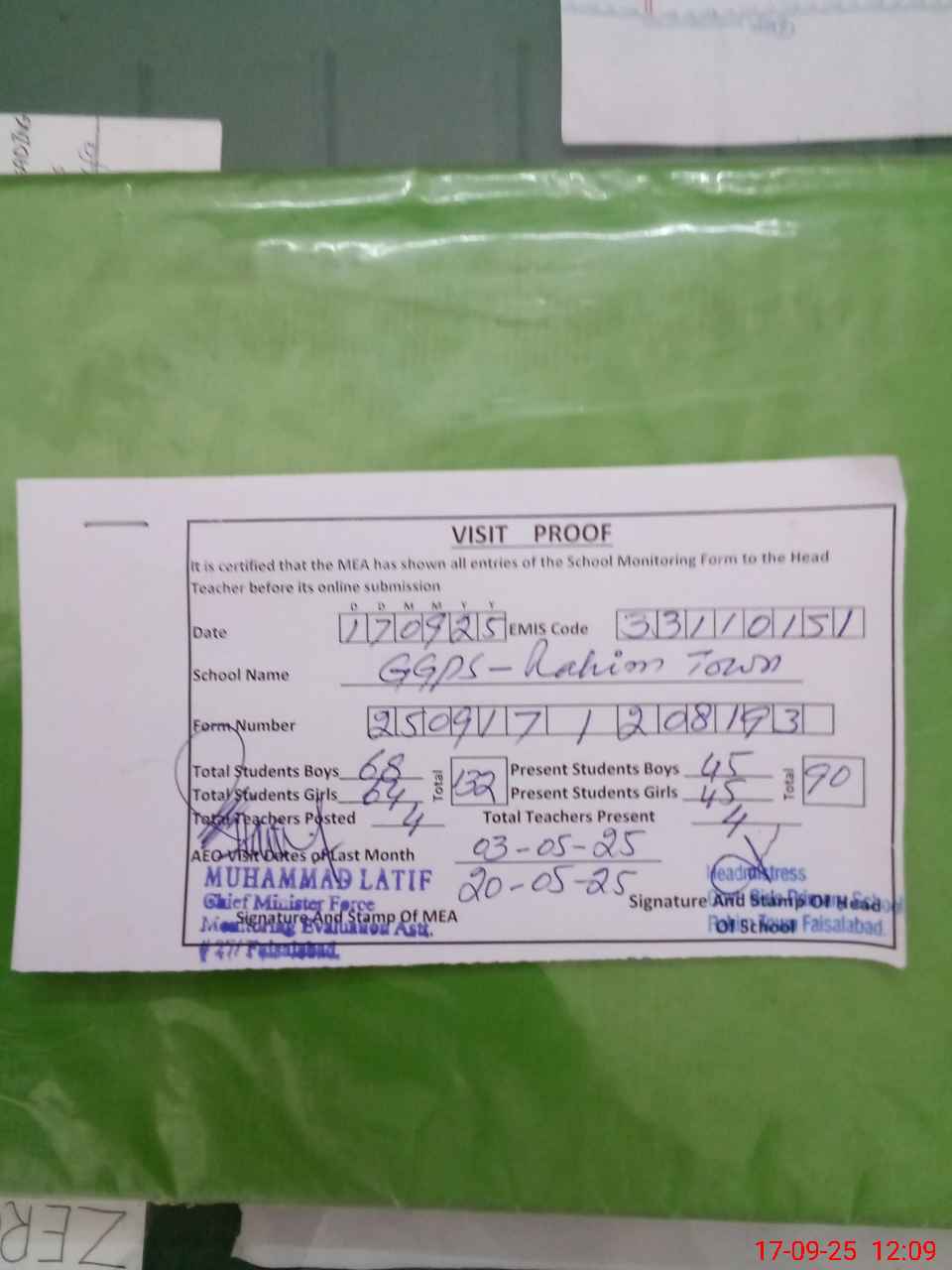 | Attendance Register | Head Teacher | MEA with School | Visit Proof |