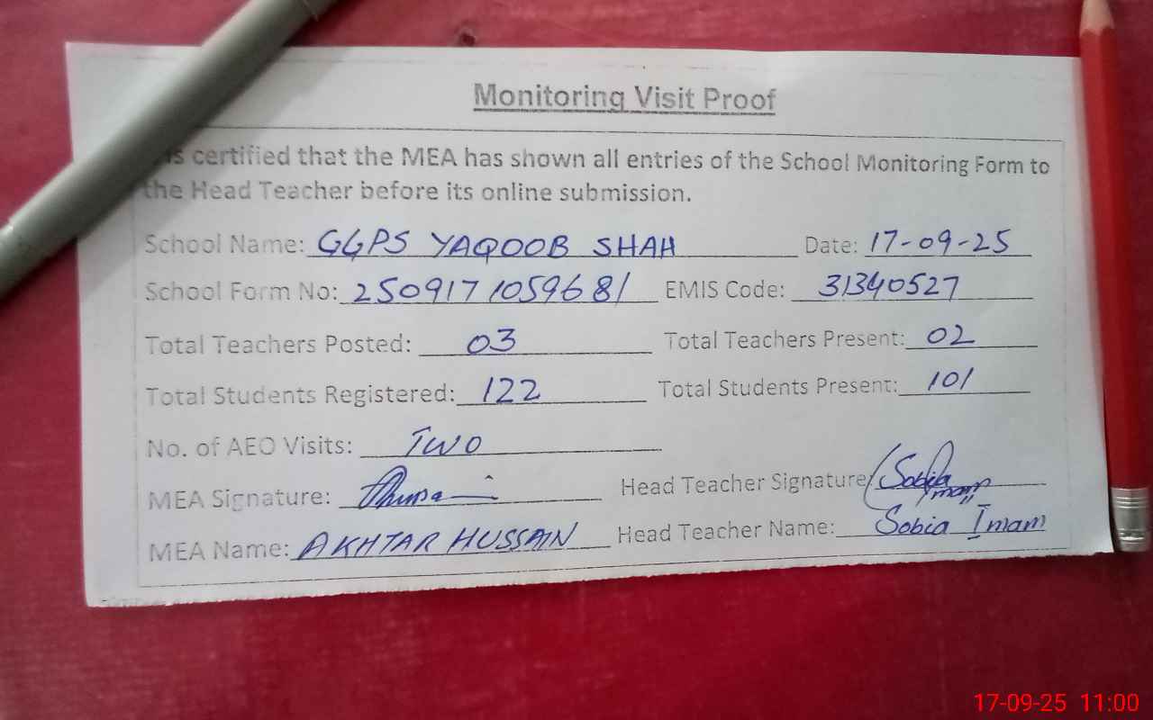 | EMIS Code: 31340527 | Name of School: GGPS YAQOOB SHAH | |||