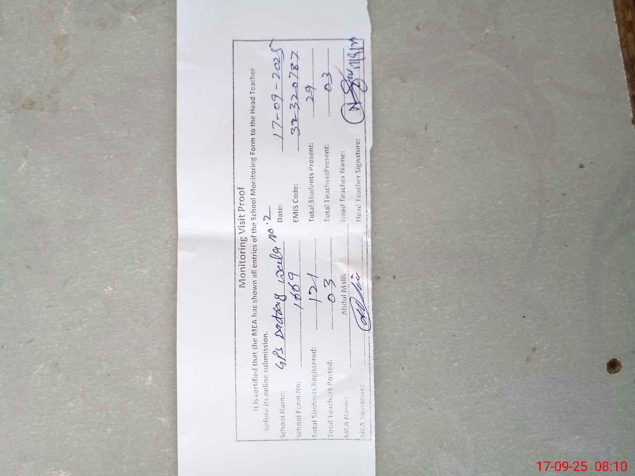 | Attendance Register | Head Teacher | MEA with School | Visit Proof |