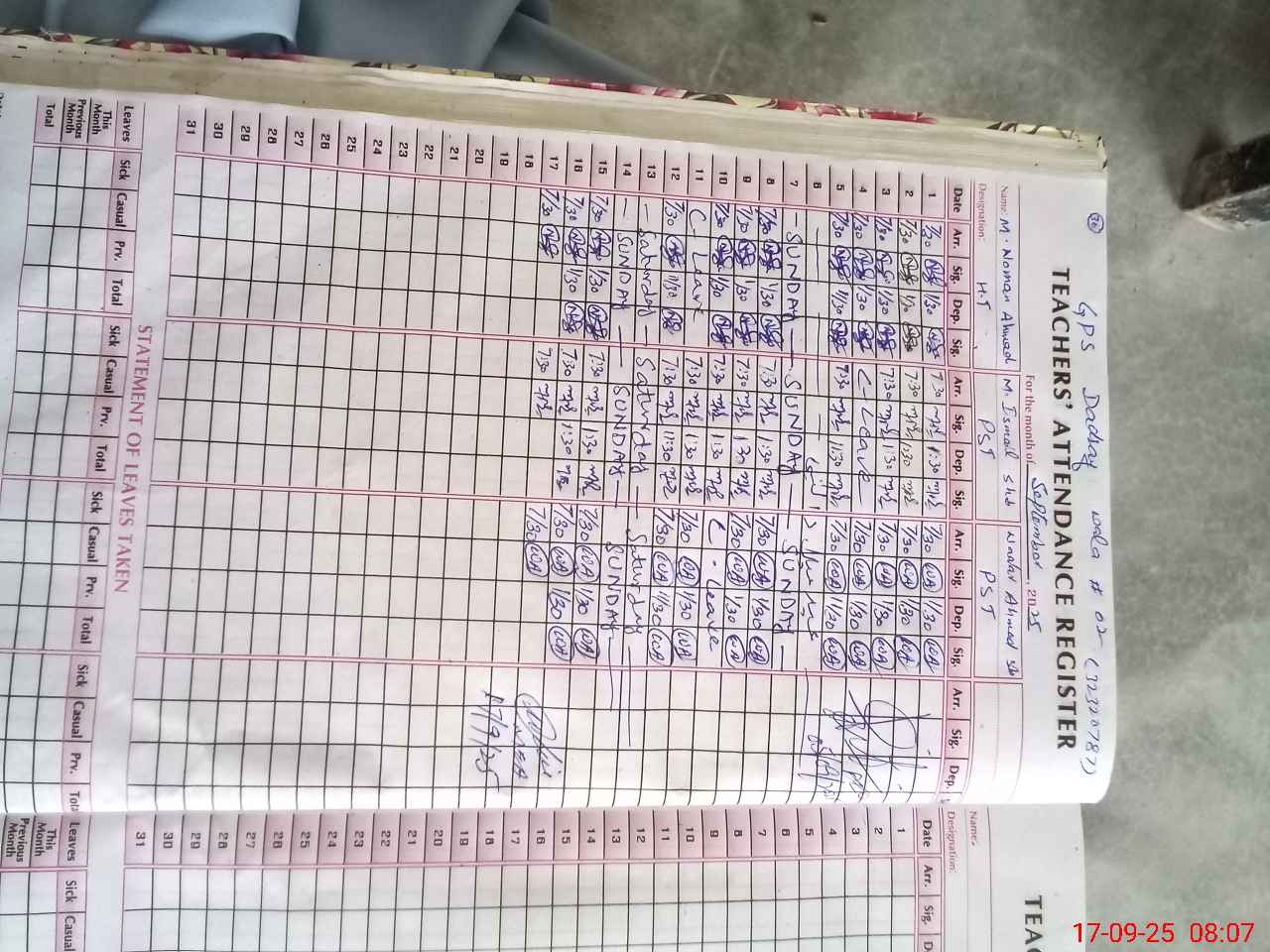 | CNIC | Full Name | Designation | R/C | Absence During Last Calender Month |