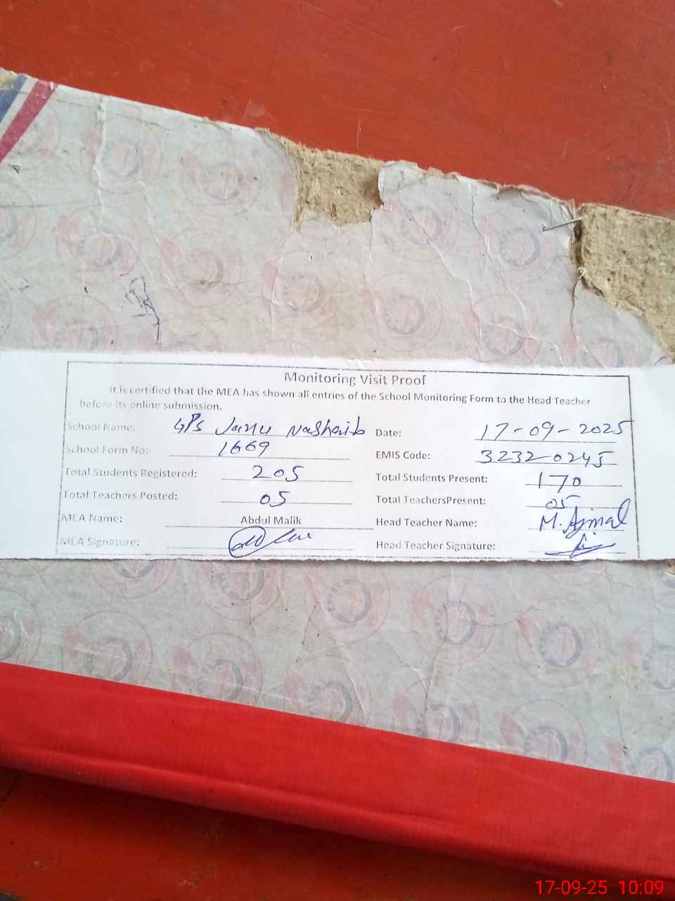 | Attendance Register | Head Teacher | MEA with School | Visit Proof |