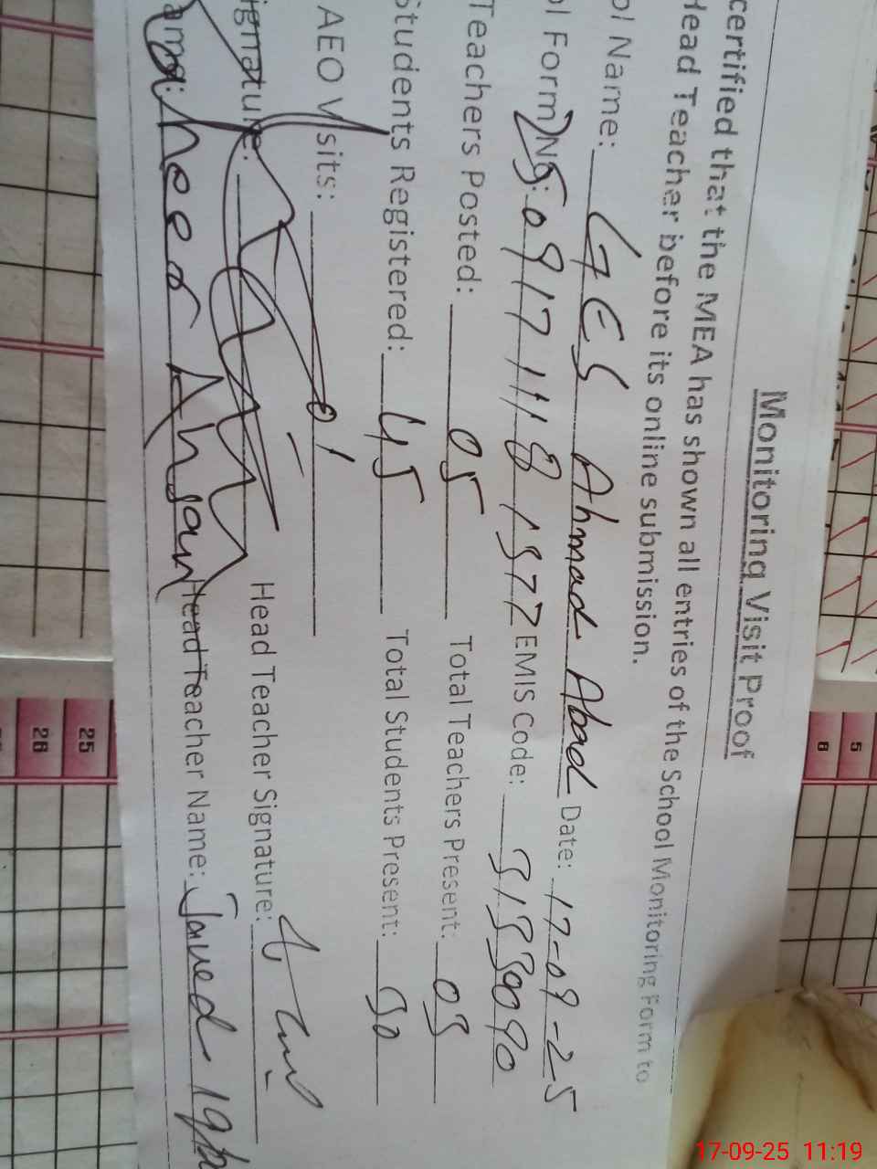 | Monitoring Date: 17-09-2025 | Start Time: 17-09-2025 10:39 AM | End Time: 17-09-2025 11:33 AM | Name of MEA: Za**** Ah**** | |
