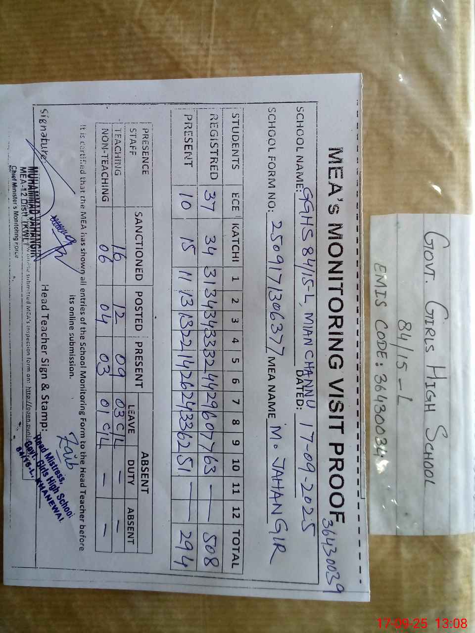 | Attendance Register | Head Teacher | MEA with School | Visit Proof |