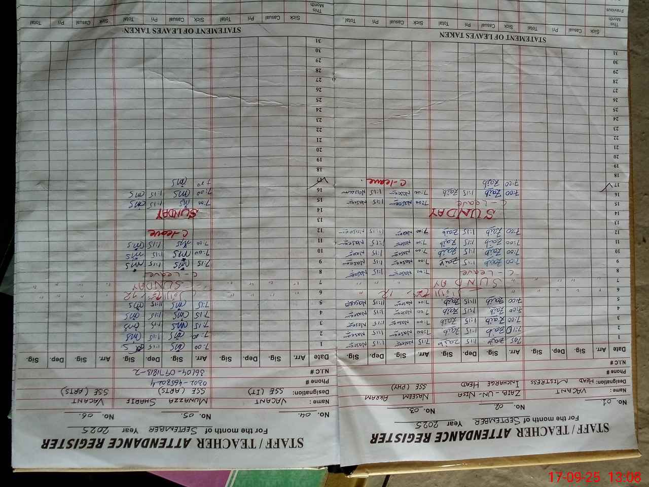 | CNIC | Full Name | Designation | R/C | Absence During Last Calender Month |