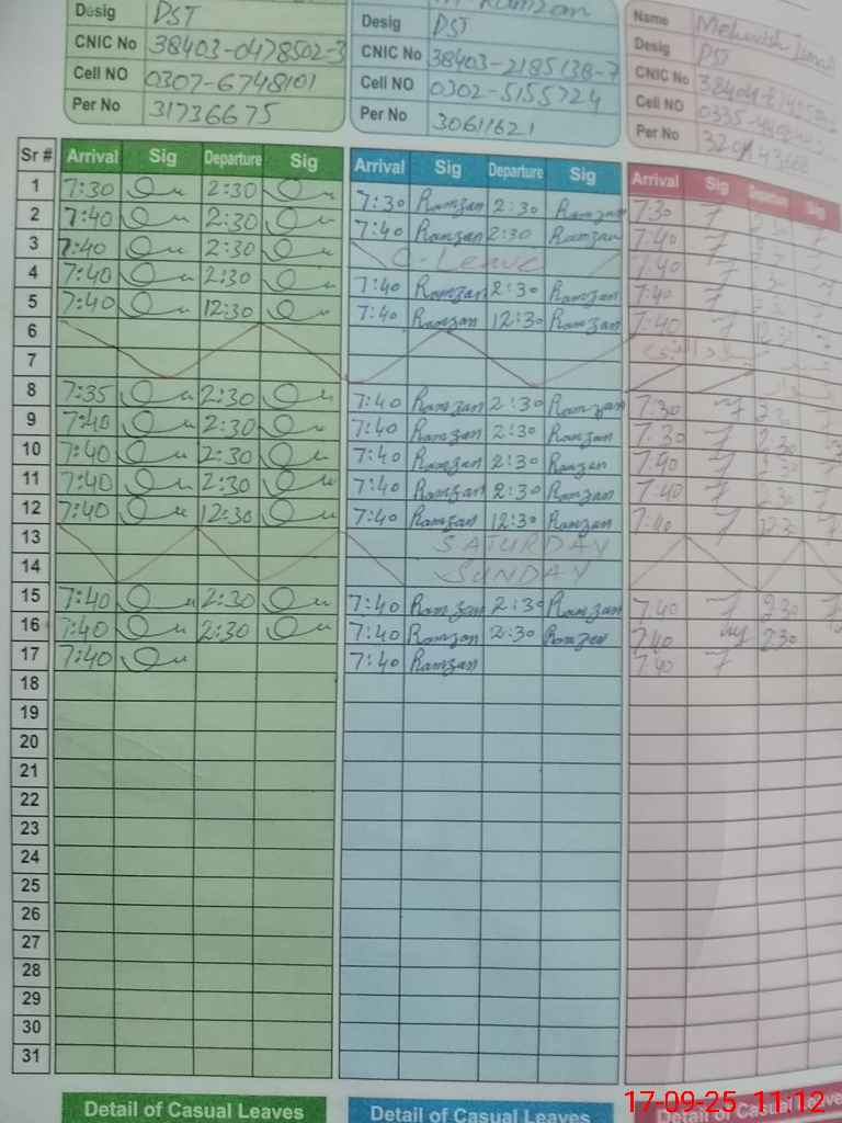 | CNIC | Full Name | Designation | R/C | Absence During Last Calender Month |