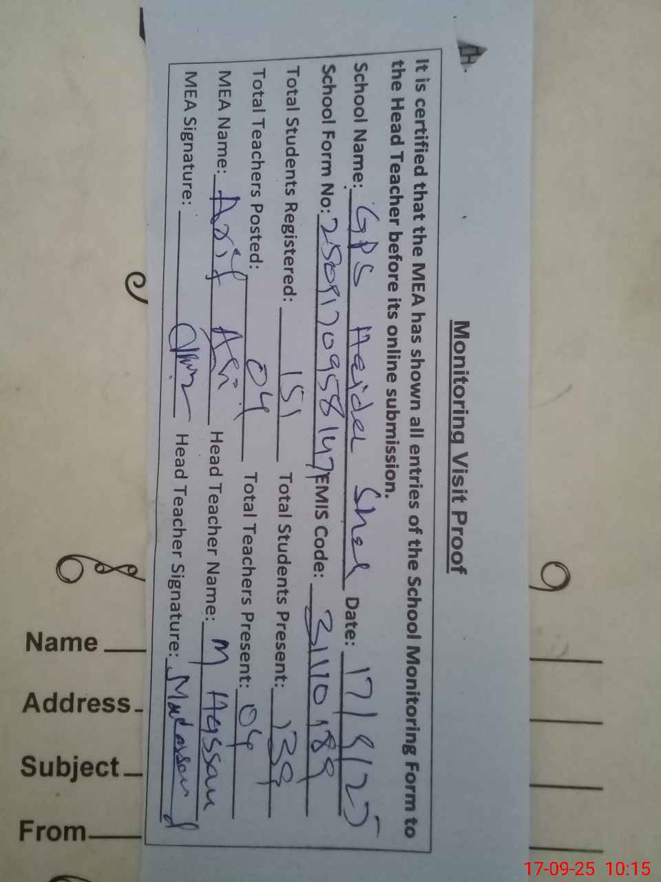 | Attendance Register | Head Teacher | MEA with School | Visit Proof |
