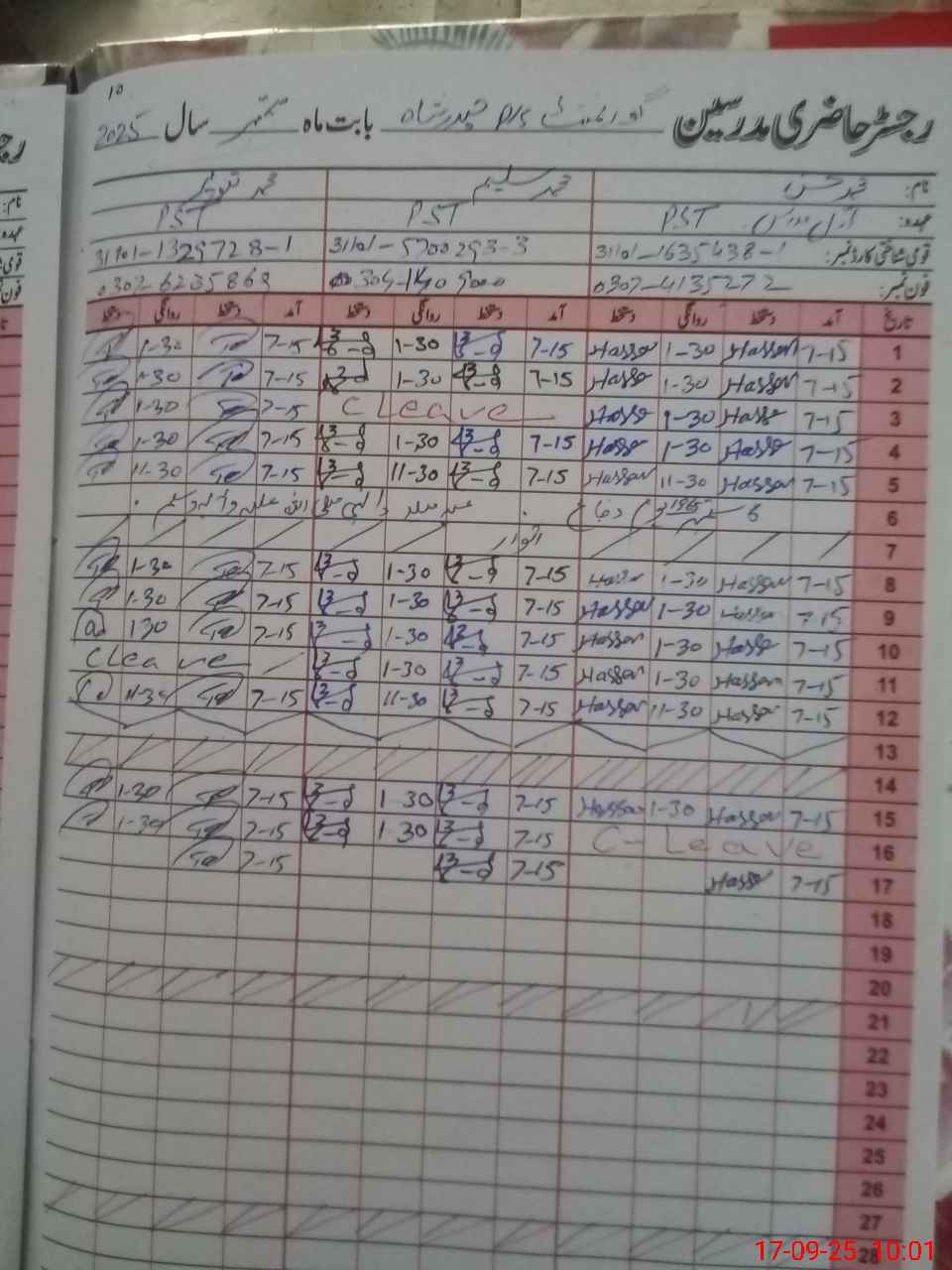 | CNIC | Full Name | Designation | R/C | Absence during last cal. month |