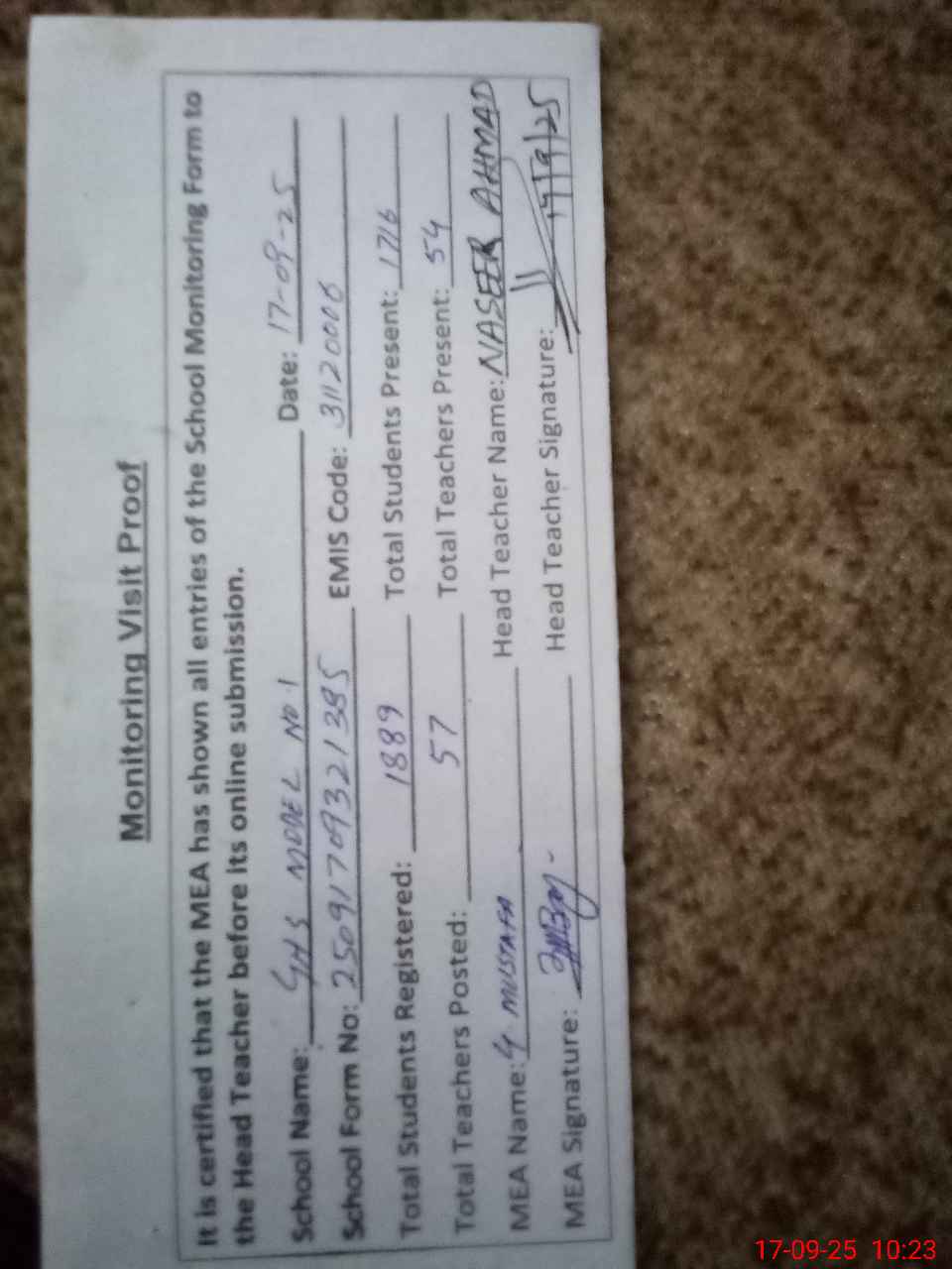 | Attendance Register | Head Teacher | MEA with School | Visit Proof |