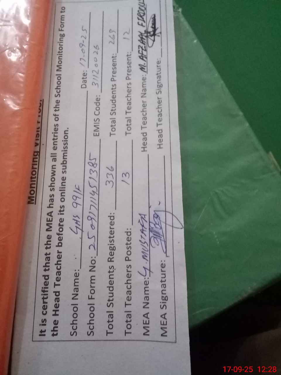 | Name: Af**** Ah**** Fi**** Designation: (School Headmaster's/Headmistress's) SHM Phone/Cell Number: 03**** |