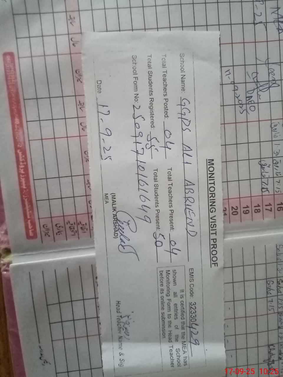 | Attendance Register | Head Teacher | MEA with School | Visit Proof |