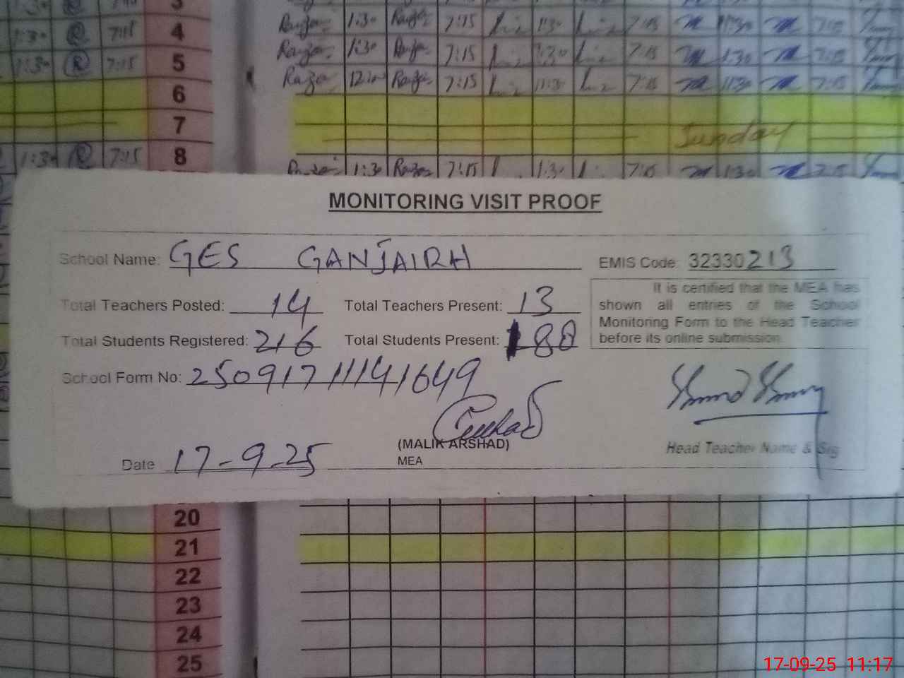 | Attendance Register | Head Teacher | MEA with School | Visit Proof |