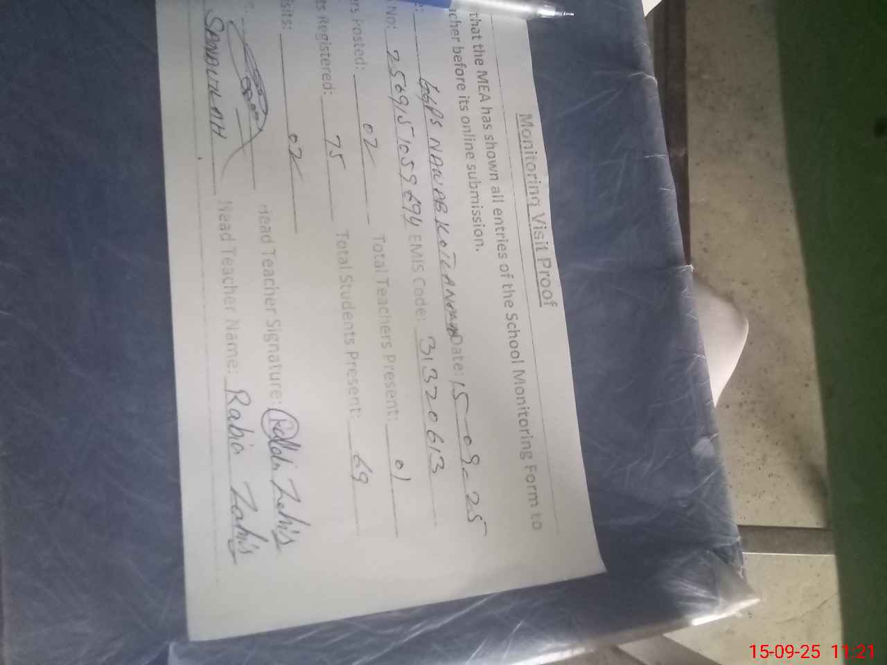 | Attendance Register | Head Teacher | MEA with School | Visit Proof |