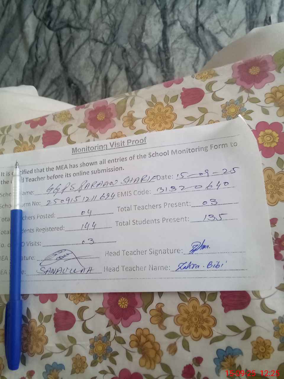 | Attendance Register | Head Teacher | MEA with School | Visit Proof |