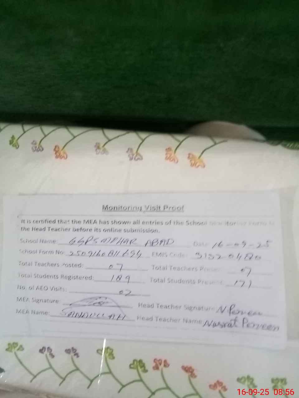 | Attendance Register | Head Teacher | MEA with School | Visit Proof |
