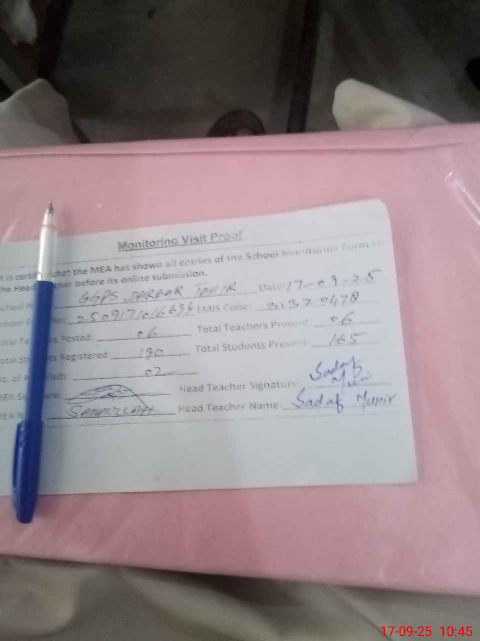 | Attendance Register | Head Teacher | MEA with School | Visit Proof |