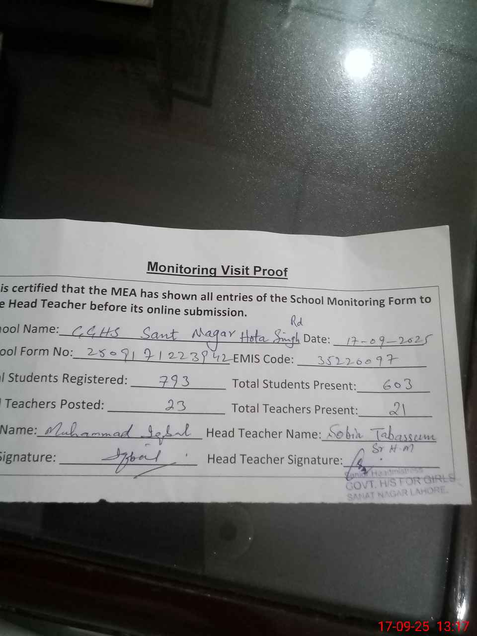 | Monitoring Date: 17-09-2025 | Start Time: 17-09-2025 12:23 PM | End Time: 17-09-2025 01:32 PM | Name of MEA: Mu**** Iq**** | |