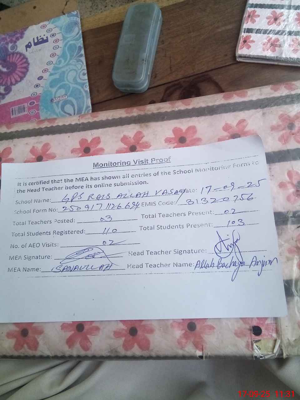 | Attendance Register | Head Teacher | MEA with School | Visit Proof |