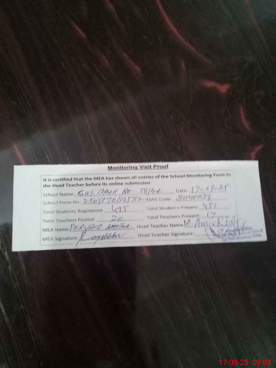 | EMIS Code: 31140039 | Name of School: GHS CHAK 58/4-R | |||