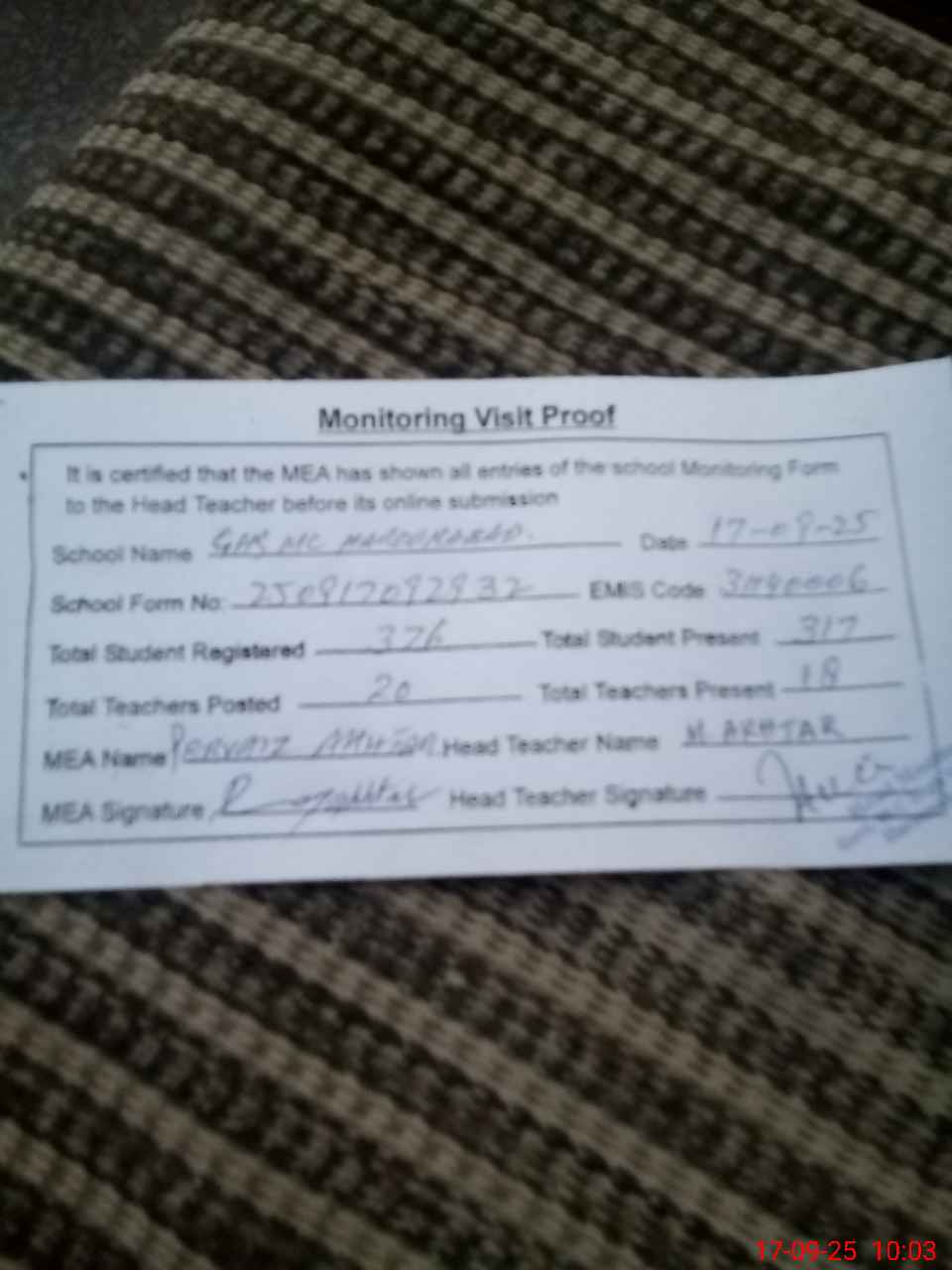 | Attendance Register | Head Teacher | MEA with School | Visit Proof |