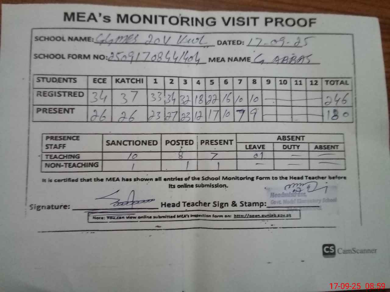 | Attendance Register | Head Teacher | MEA with School | Visit Proof |