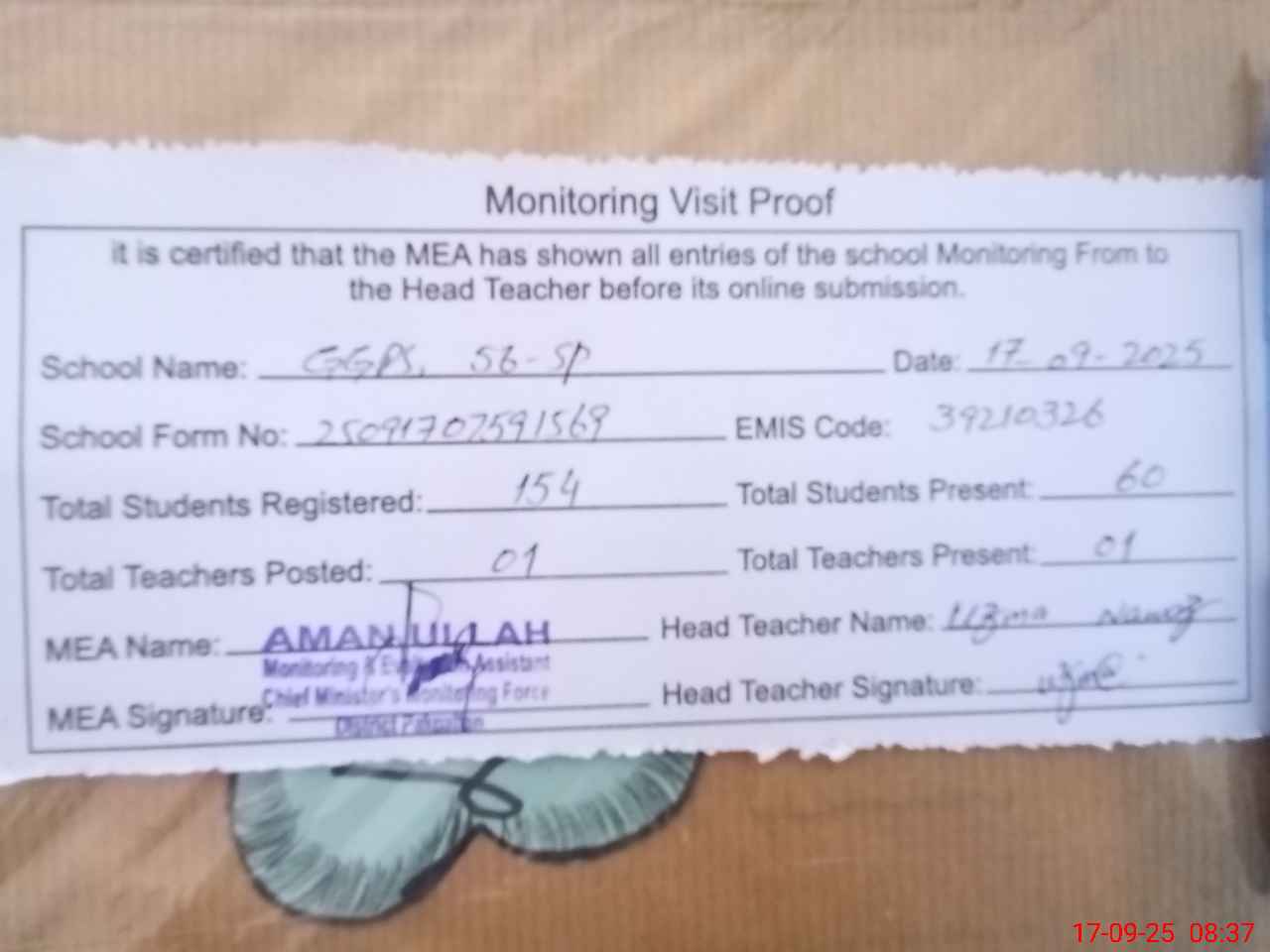 | Attendance Register | Head Teacher | MEA with School | Visit Proof |