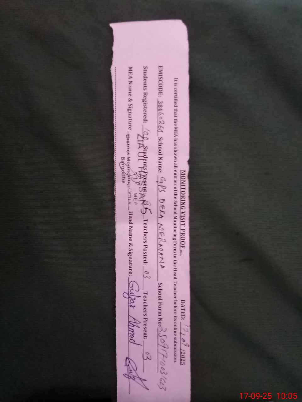 | Monitoring Date: 17-09-2025 | Start Time: 17-09-2025 09:40 AM | End Time: 17-09-2025 10:05 AM | Name of MEA: ZI**** ULHA**** | |