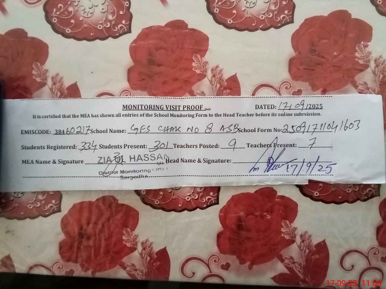 | Attendance Register | Head Teacher | MEA with School | Visit Proof |