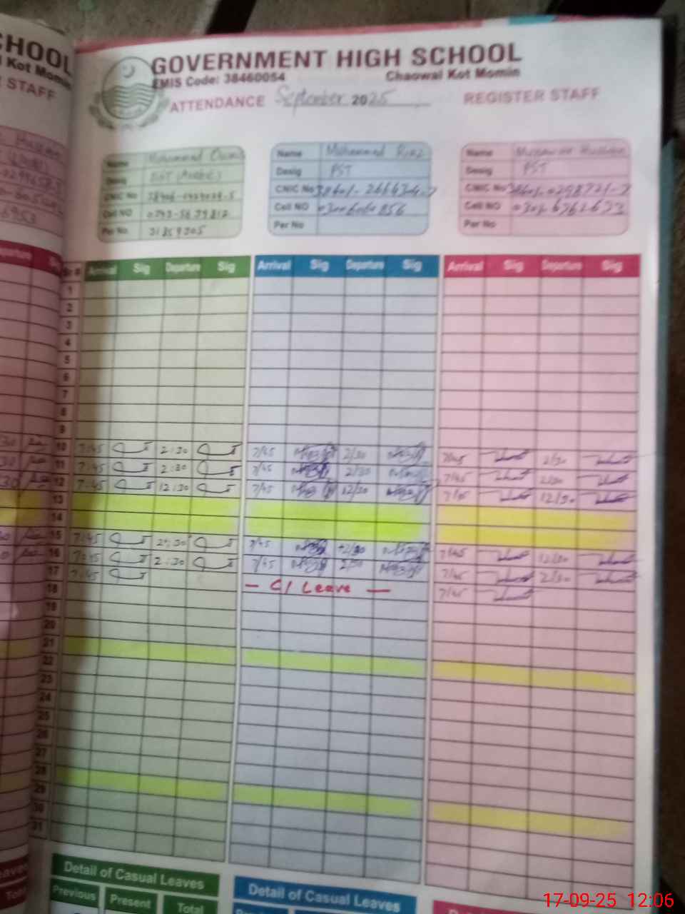 | CNIC | Full Name | Designation | R/C | Absence during last cal. month |