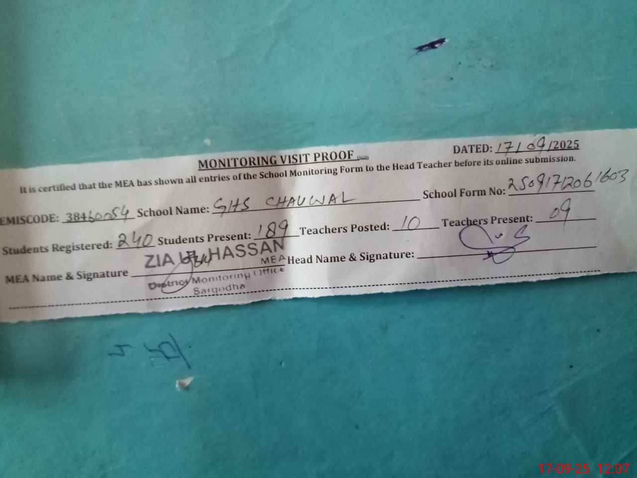| Attendance Register | Head Teacher | MEA with School | Visit Proof |