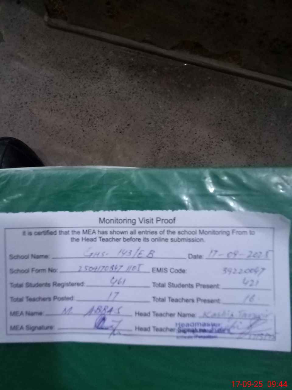 | Attendance Register | Head Teacher | MEA with School | Visit Proof |