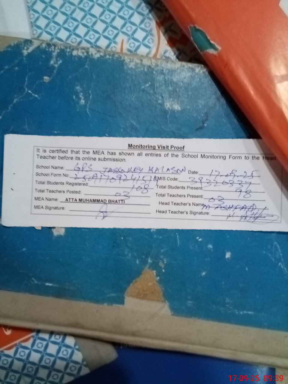 | Attendance Register | Head Teacher | MEA with School | Visit Proof |