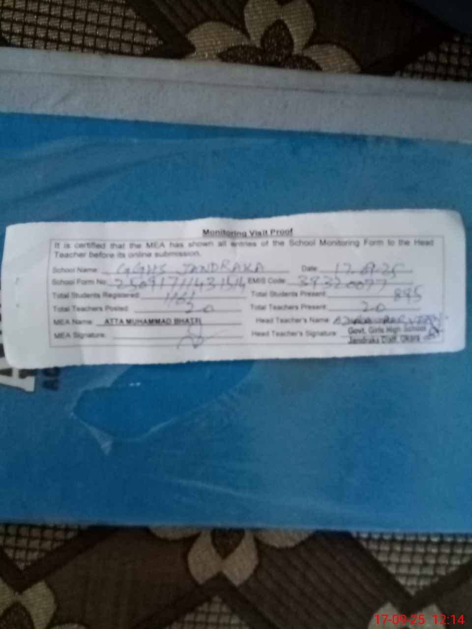 | Attendance Register | Head Teacher | MEA with School | Visit Proof |