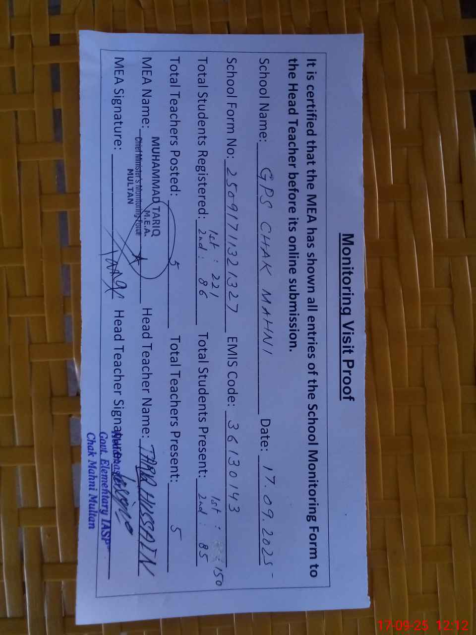 | EMIS Code: 36130143 | Name of School: GPS CHAK MAHNI | |||