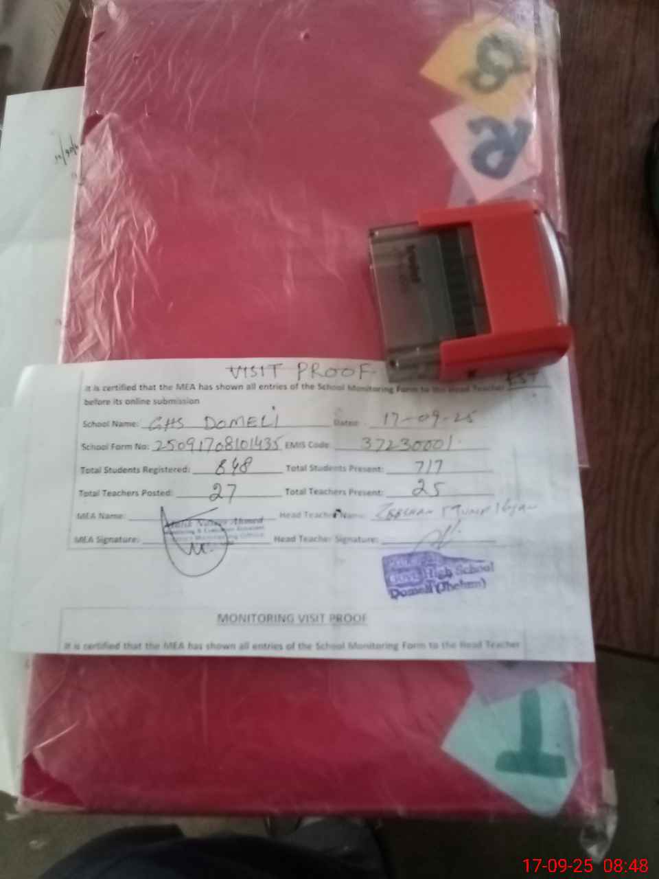 | Attendance Register | Head Teacher | MEA with School | Visit Proof |