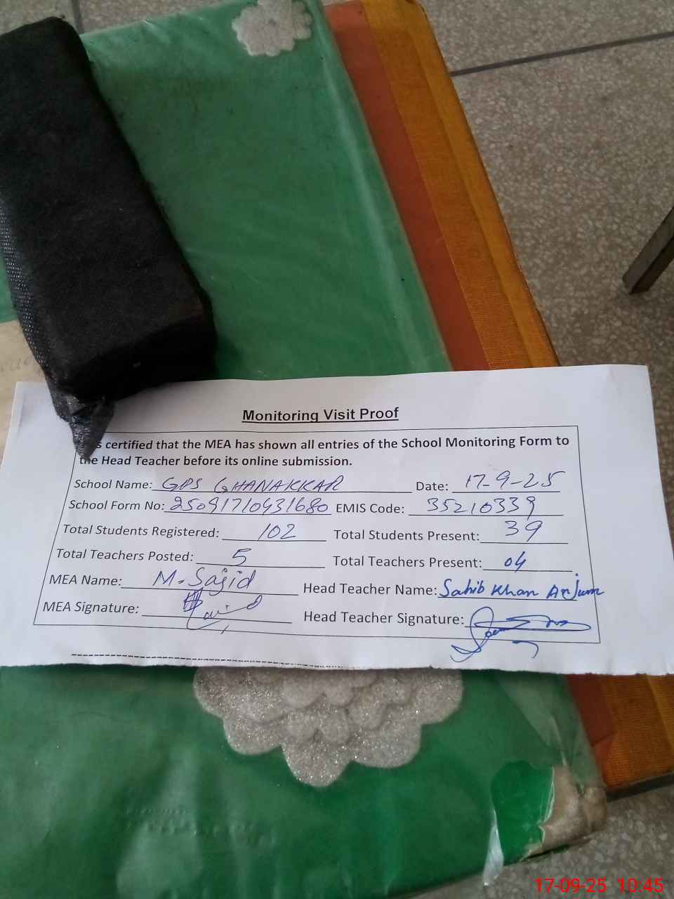 | Attendance Register | Head Teacher | MEA with School | Visit Proof |