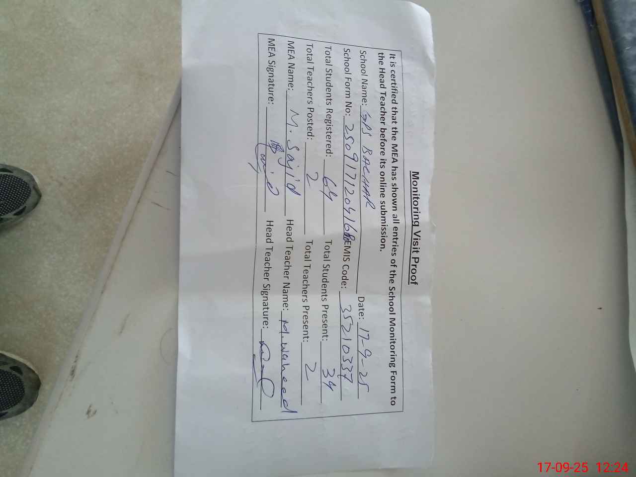 | Remarks (Use Separate Page if Required): Present students percentage is 53 School is shifted to own building one week before and functional in morning time NSB and FTF accounts are non functional because of out sourcing of this school Books receiving record is not available Boundary wall is broken from one side 35210337 | |||||