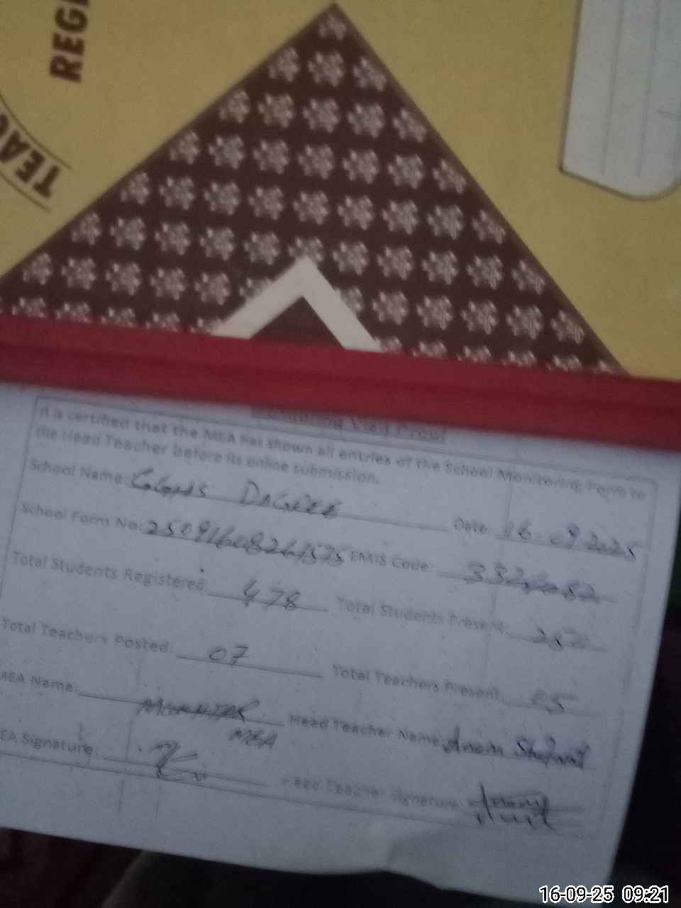 | Attendance Register | Head Teacher | MEA with School | Visit Proof |