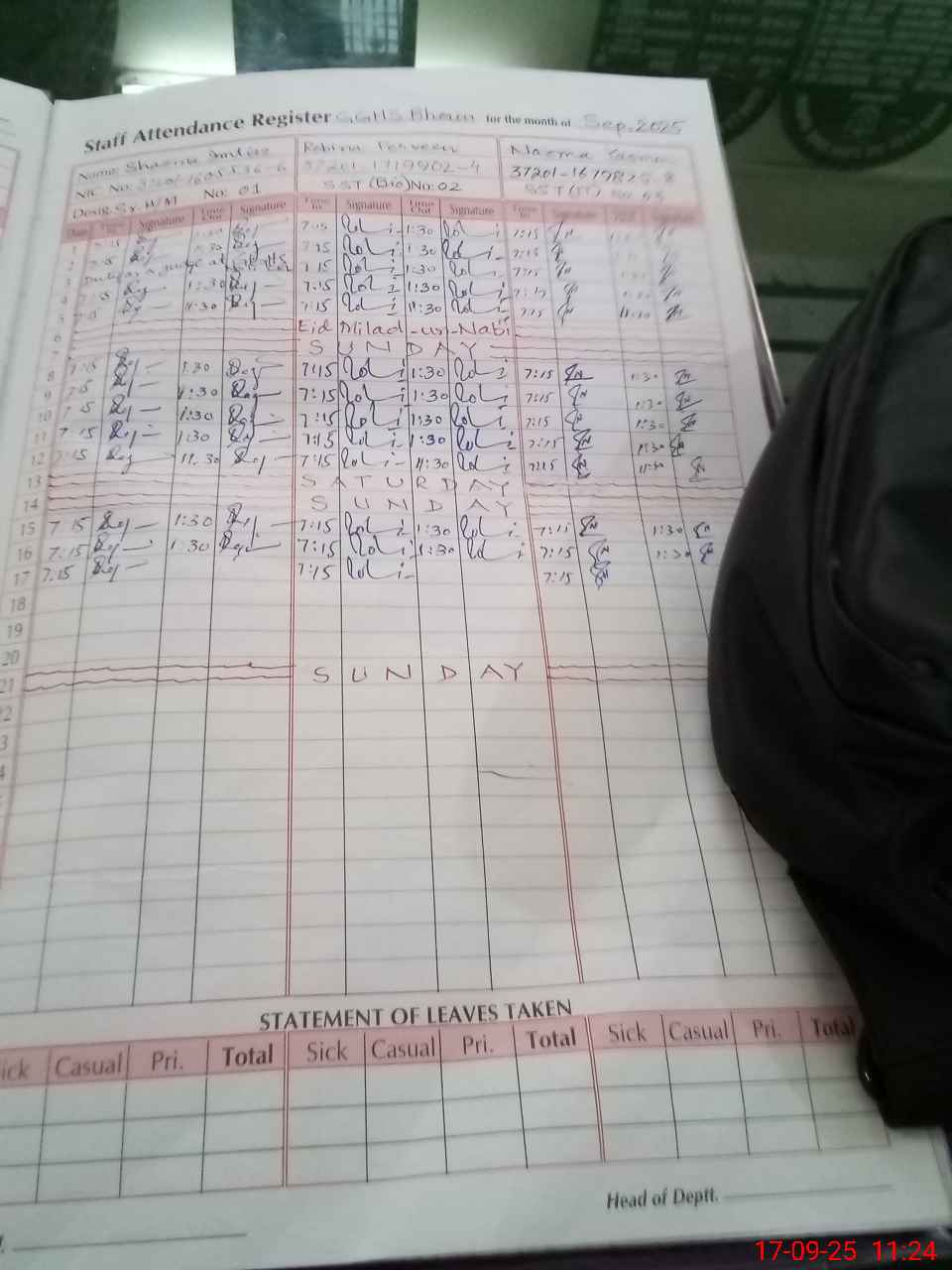 | CNIC | Full Name | Designation | R/C | Absence During Last Calender Month |