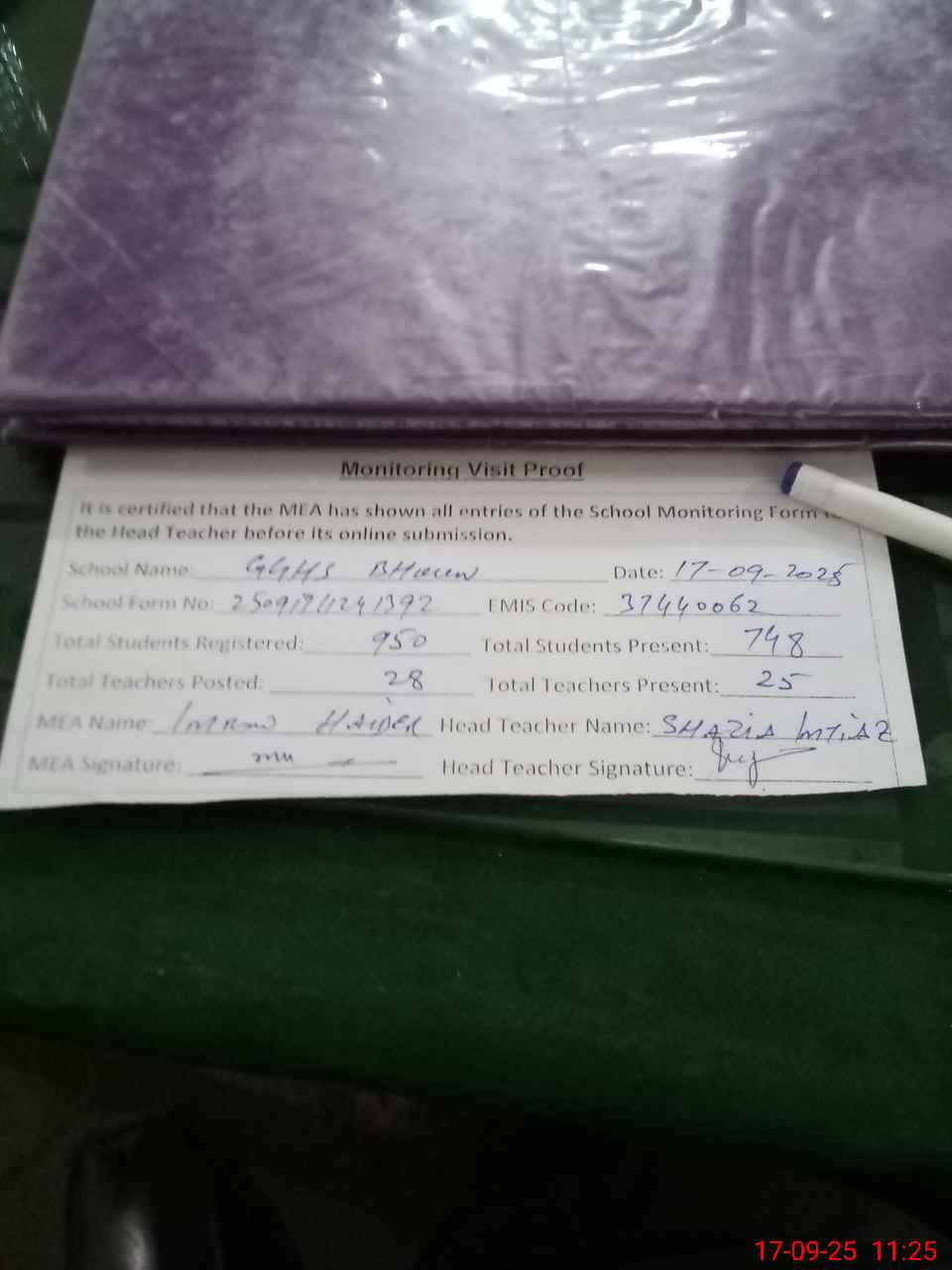 | Attendance Register | Head Teacher | MEA with School | Visit Proof |