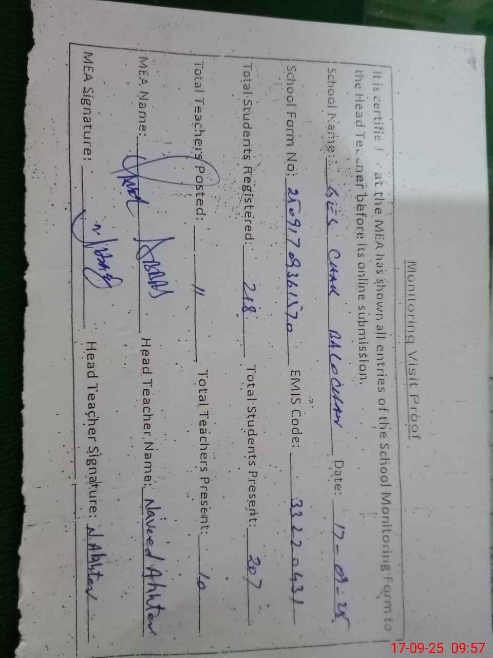 | Attendance Register | Head Teacher | MEA with School | Visit Proof |