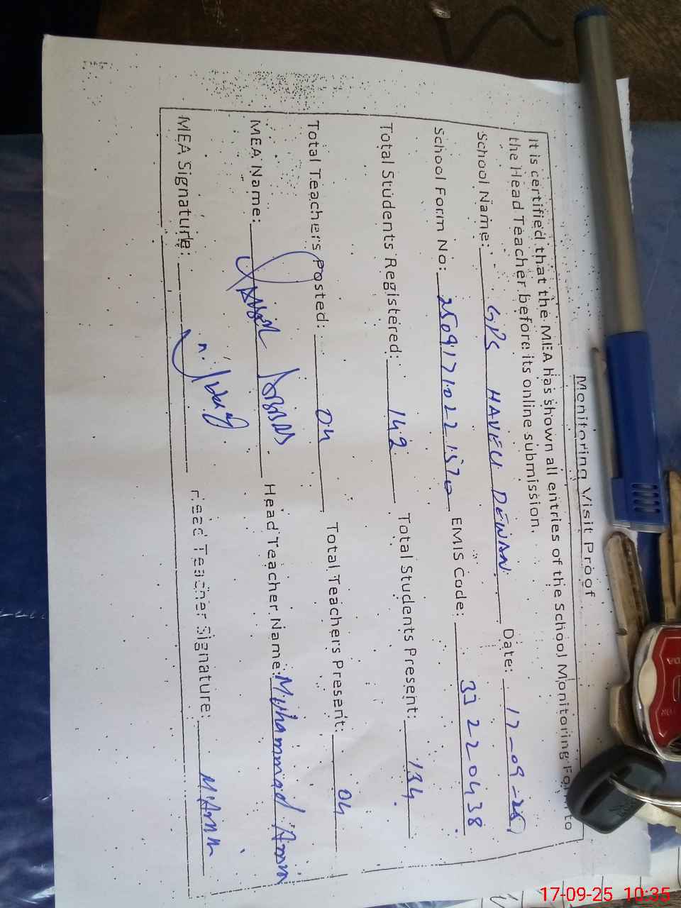 | Attendance Register | Head Teacher | MEA with School | Visit Proof |
