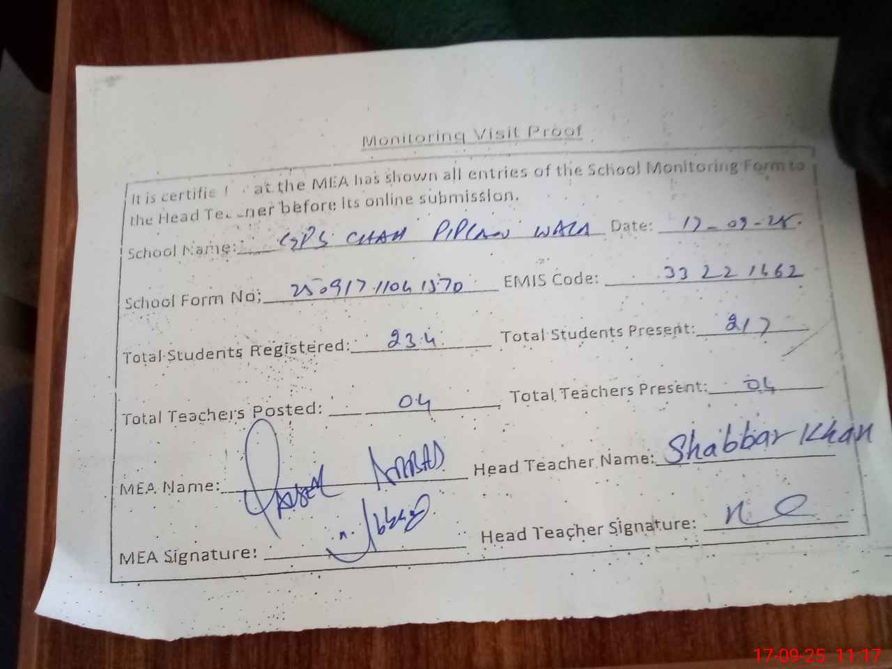 | EMIS Code: 33221462 | Name of School: GPS CHAH PIPLAN WALA | |||