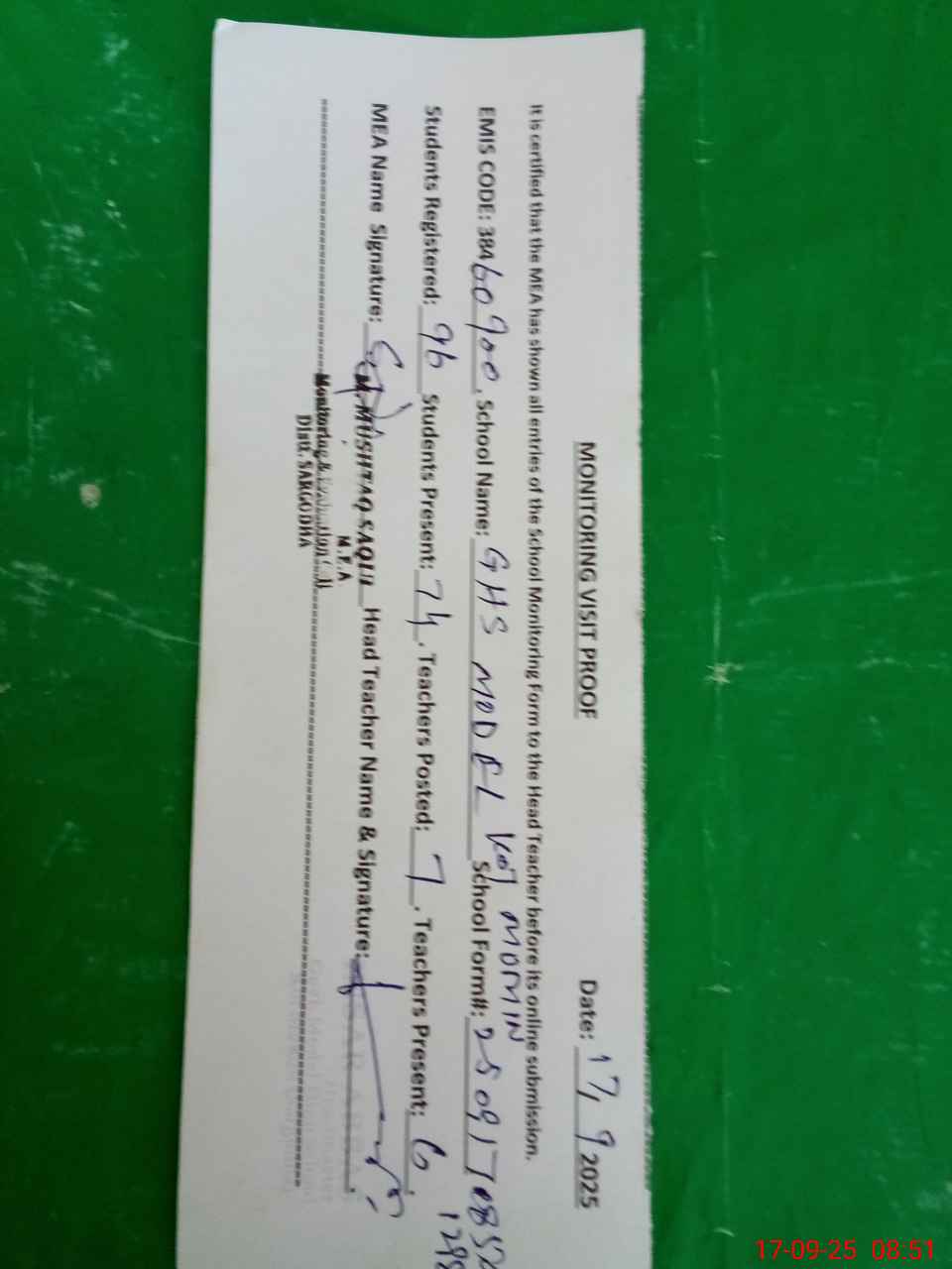 | Attendance Register | Head Teacher | MEA with School | Visit Proof |